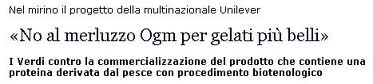Pubblicato: 2006/07/31 Archiviato in: Food design 4 commenti“No al merluzzo OGM per gelati piu’ belli”. E’il titolo apparso sul Corriere della Sera. La notizia di cui si parla, non riguarda comunque un pesce transgenico bensì una proteina ottenuta da una specie ittica artica.Che cos’ è la misteriosa “anti-freeze protein” già impiegata dalla Unilever negli USA e la cui autorizzazione è stata chiesta alla Food Standard Agency (FSA)?