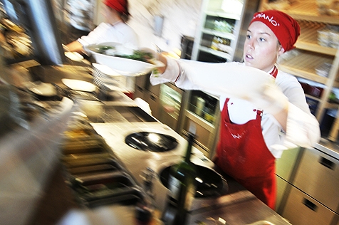 Pasta e pizza preparate sul momento, of course. A’a.d. afferma che mozzarella, parmigiano e pomodori sono acquistati in Italia. Siccome sono tedeschi, quindi efficientissimi, forniscono all’ingresso una tessera magnetica dove il cliente registra le ordinazioni. In coda ai banconi a vista, il diligente consumatore vedrà preparare davanti ai suoi occhi gli italici manicaretti, smarcherà la tessera e si accomoderà ai tavoli. Alla fine un inserviente sparecchierà per lui le stoviglie in ceramica e vetro. Pagamento alla cassa scaricando la tessera. Vapiano ha mediamente 900 clienti al giorno per punto vendita e 1.100 dipendenti, tra tedeschi e nativi dell’est Europa.