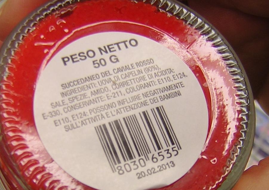 Come impartire il colore rosso alle uova di capelin? Avete letto bene, con i coloranti E110 (o sunset Yellow) e E 124 (rosso cocciniglia), e anche i produttori del succedaneo del caviale rosso sono obbligati a inserire in etichetta la dicitura “può influire negativamente sull’attività e sull’attenzione dei bambini” come prevede l’allegato V del regolamento europeo 1333/2008 sui coloranti azoici.