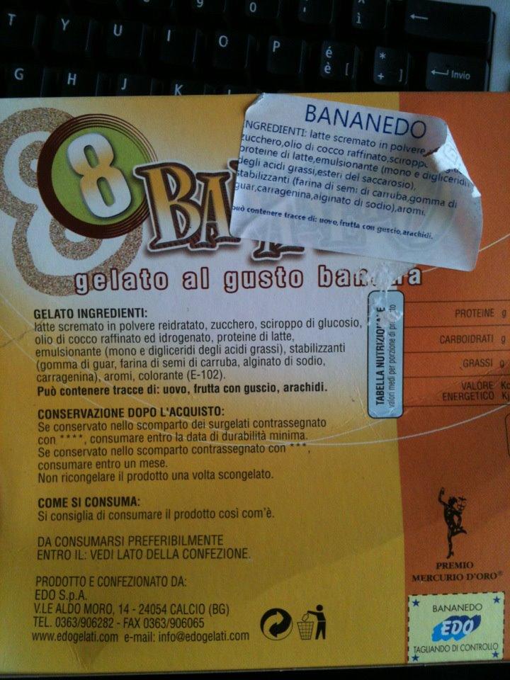 Pubblicato: 2012/06/21 Archiviato in: Additivi, Aromi, Coloranti 3 commentiAntonella in veste di gastro-photoreporter ha trovato un esempio di gelato al gusto banana in cui è impiegato l’olio di cocco raffinato di cui ho scritto di recente. Gli fanno compagnia il latte scremato in polvere, zuccheri e addensanti vari, aromi e il colorante tartrazina. E la frutta? non pervenuta.