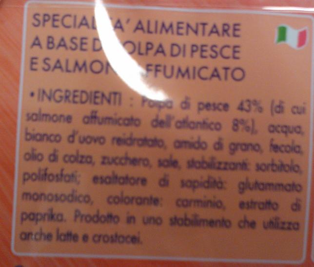 Cosa fanno il 43 % di polpa di pesce (quale? ) di cui solo l’8% salmone affumicato dell’Atlantico insieme ad addensanti, stabilizzanti, esaltatore di sapidità e coloranti? fanno questo preparato avvistato ieri nel banco frigo. Leggo che il prodotto di cui ho immortalato l’etichetta è tra gli eletti come Sapore del’Anno 2012, iniziativa che ha l’obiettivo di “certificare la qualità gustativa dei prodotti alimentari mediante un test”.