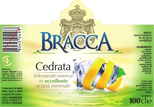 la Cedrata Bracca: Acqua, zucchero, anidride carbonica, acidificante acido citrico, aromi, conservante sorbato di potassio, colorante E 102.