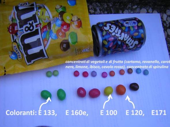 Sono i piu’ piccoli della foto. A confronto ci sono i confetti M&M in cui continuano ad essere impiegati i coloranti impiegati da anni: E 133,E 160e, E 100, E 120, E171, anche se ho visto che sono scomparsi dal sacchetto i confetti blue.