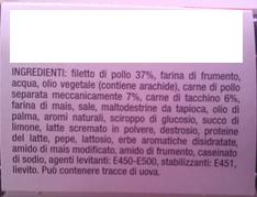 Pubblicato: 2012/09/01 Archiviato in: Additivi, Aromi, Food design, La borsa della spesa 13 commentiTra gli ingredienti la carne separata meccanicamente di cui si è ampiamente parlato in passato, una serie di meat fillers come l’amido modificato da tapioca, amido di frumento, maltodestrine, anche edulcoranti come lo sciroppo di glucosio e il destrosio.Seguono agenti lievitanti e stabilizzanti. Cosa potrà essere?