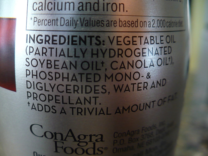 Mentre qui si parla di punto di fumo degli oli e ci si chiede quale olio sia meglio in cucina, a Menphys con una spruzzata si risolve tutto. Lo spray PAM sembra insostituibile in cucina. Una breve ricerca e scopro un mondo inesplorato, ben 8 flavours possibili tra cui “Olive oil”, “Butter flavour” e non manca l'”Organic“. Cosa c’è dentro la versione “Professional”? oli vegetali parzialmente idrogenati di soia e olio di canola oltre a mono e digliceridi fosfato e propellente. Fantastica la scritta “Adds a trivial amount of fat” 🙂