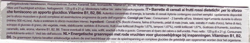Ingredienti: Fiocchi di riso e di grano integrale, zucchero, glutine, germe di grano, latte scremato in polvere sale,estratto di malto d’orzo, ), sciroppo di glucosio,frutti rossi (9%) (zucchero, ossicocco, regolatore di acidità:acido citrico,aromi, succo di bacca di sambuco concentrato,olio vegetale), sciroppo di zucchero invertito, sciroppo di glucosio-fruttosio, olio vegetale idrogenato, umidificanti:glicerolo e sorbitolo, aroma, emulsionante lecitina di soia, regolatore di acidità:acido citrico
