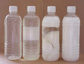 Il punto di fusione dell’olio di cocco è di 24°C quindi a temperature superiori si presenta liquido, sotto questa temperatura si presenta solido. Ecco delle bottigle sottopoate a temperature decresecenti. A sinistra l’olio completamente liquido e a destra la bottigli in cui il grasso si è solidificato.