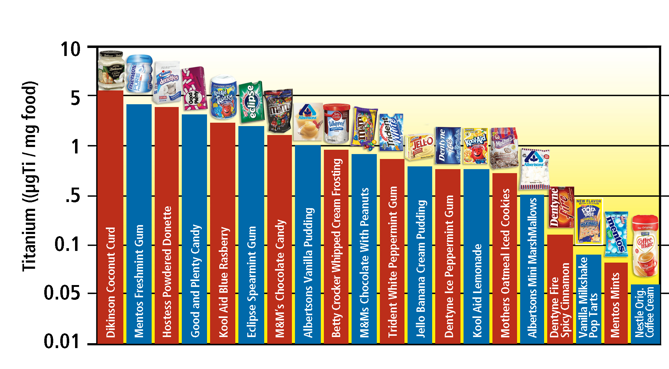 Seguono le Mentos Freshmint Gum. Diversi prodotti contenevano da 0.01 a 1 mg per porzione. Tra i prodotti con le concentrazioni maggiori, le gomme da masticare con livelli > 0,12 ugTi/mg. I livelli sono stati quantificati anche in confetti al cioccolato. Ad es. negli M&M il Titanio risultava 1,25 ug/mg. Sono stati anche analizzati dei prodotti caseari, ricordate la mozzarella al biossido di titanio? Alcuni drinks a base di latte scremato possono contenere il biossido aggiunto per rafforzare il colore. In media nei prodotti analizzati i livelli di titanio erano compresi tra 0,02 e 0,006 mg per porzione (240ml).