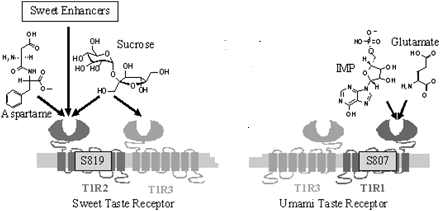 Perché si usano i nucleotidi come esaltatori di sapidità? Come anticipato, si è dimostrato che la l’interazione tra glutammato libero, IMP e GMP, genera sensazioni gustative amplificate rispetto a quelle che si hanno con ogni singolo ingrediente, il risultato? una moltiplicazione del gusto umami. A livello della lingua sono stati scoperti diversi recettori per il gusto umami, tra cui taste-mGluR4, T1R1/T1R3. Si tratta di recettori metabotropici costituiti da un recettore accoppiato ad altre proteine, tutti appartengono alla famiglia delle GTP binding protein. Studi recenti hanno dimostrato che la molecola T1R1/T1R3 per il gusto umami, appartiene alla famiglia di recettori T1R che include anche T1R2/T1R3 a cui dobbiamo la capacità di riconoscere il sapore dolce.