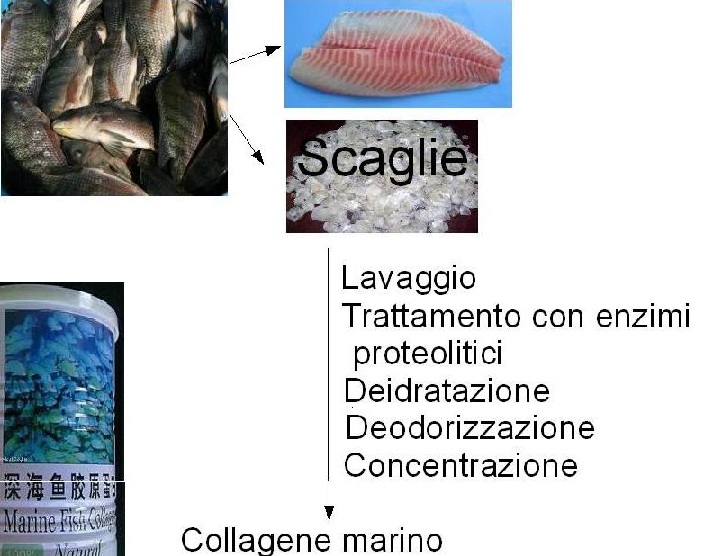 Si utilizzano le scaglie del pesce e mediante trattamenti con acidi e alcoli, deodorizzazione e enzimi proteolitici si ottengono i polipeptidi del collagene.