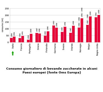 – Il consumo di bevande zuccherate (soft drinks) è in aumento in quasi tutti paesi europei negli ultimi dieci anni. Il consumo è maggiore nel Nord-Europa rispetto ai Paesi mediterranei e maggiore fra gli uomini rispetto alle donne. Ecco i dati in cui Italia e altri stati europei sono a confronto salute.gov.it.